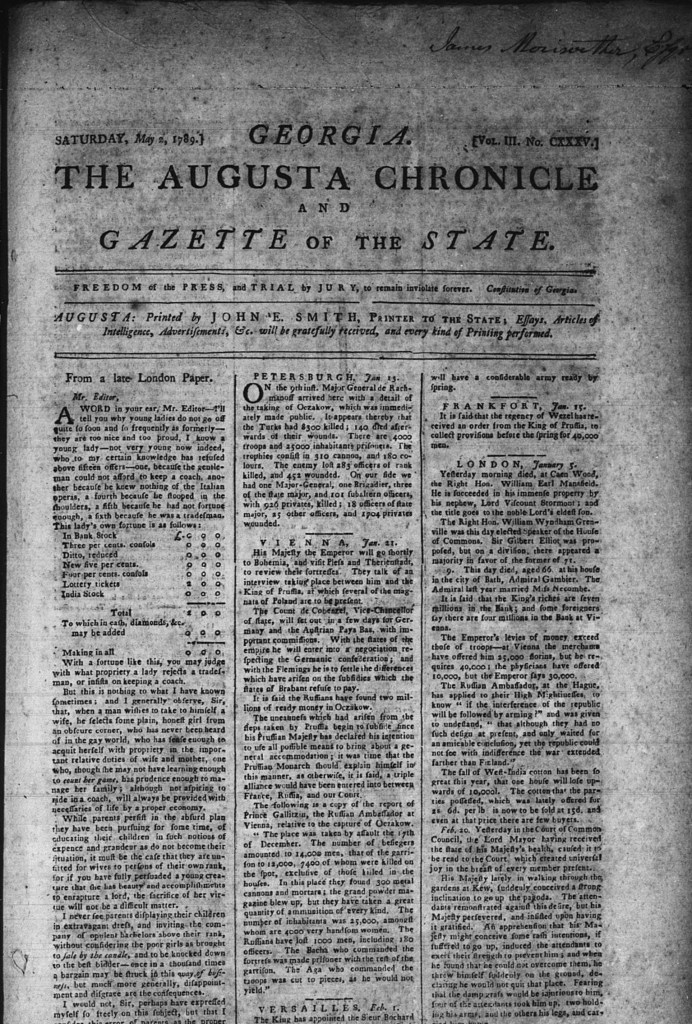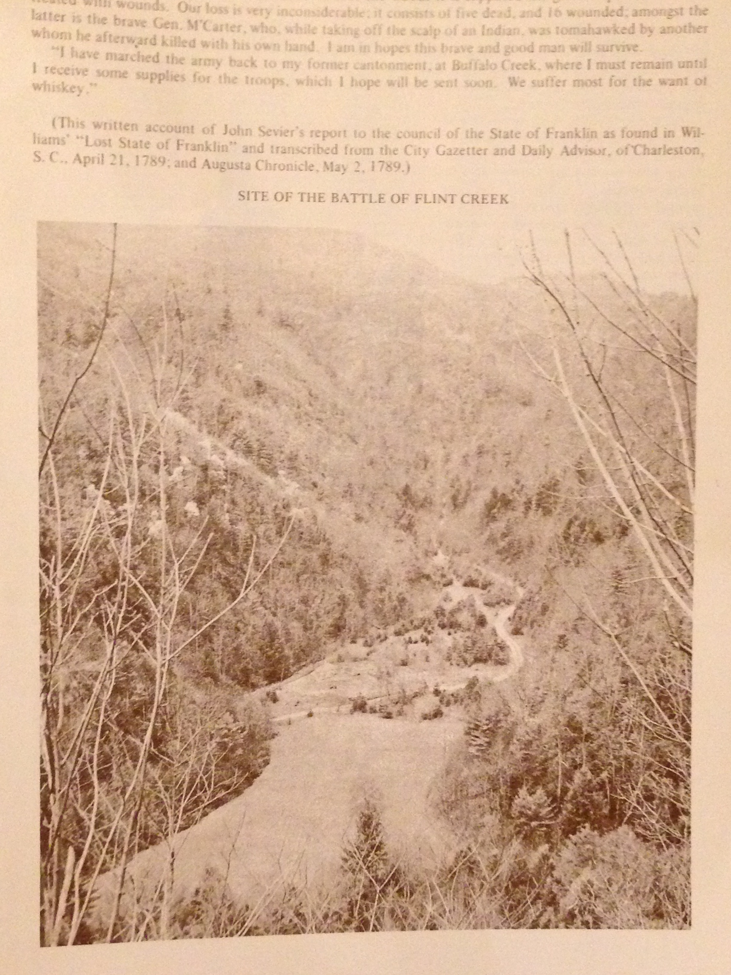 If you had been around in 1789, and in Augusta, GA, in May, you could have picked up the May 2 edition of the Augusta Chronicle, which contained Sevier’s letter announcing his triumph over the Indians. On the same page can be found an article announcing salaries which had been set for officers of the fledgling State of Franklin, with the top officials salary being 1,000 deer skins per year. Unlikely as it seems, the Library of Congress has a microfilm record of that paper and a photo is included here so you can read the news of the Flint Creek massacre just as folks in 1789 did.